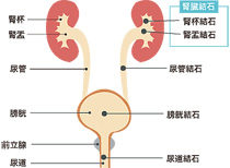 腎臓、尿管、膀胱、尿道にできる結石。鋭い痛みや血尿をともなうことも。